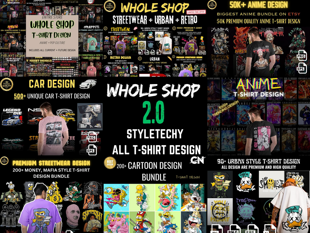 Whole Shop 2.0 Mega Bundle of Anime, Pop Art & All Type Of T-shirt Designs for PNG, EPS, T-shirt all in one SvG bundle file, STYLETECHY Shop